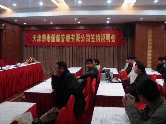 2010年1月12日“天津鼎泰船舶管理有限公司签约说明会”在天津市远洋宾馆隆重举行,鼎泰集团领导、鼎泰船舶管理公司负责人、公司相关职能部门负责人和学生以及家长出席大会。会上鼎泰集团领导以及鼎泰船舶管理公司负责人针对集团经营战略,未来人才需求以及当前海员就业市场等内容发表重要讲话。大会取得圆满成功,全体学生均与鼎泰船舶管理公司签订“委培就业协议”正式成为鼎泰公司的委培学员。